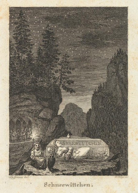 In further evidence of the religious tone of the story, the dwarfs wash Snow White’s body with water and wine, and all work stops for three days while they mourn (Murphy, 128). Here it is helpful to examine the symbolism present in the illustration (medium unknown, but most likely an etching) by Ludwig Emil Grimm, one of the younger brothers of Jacob and Wilhelm, for the 1825 “Little Edition” of the KHM. The image shows Snow White in the glass coffin that the dwarfs have fashioned for her, placed on top of a mountain, and guarded by one of the dwarfs and three birds: an owl, a raven, and a dove.