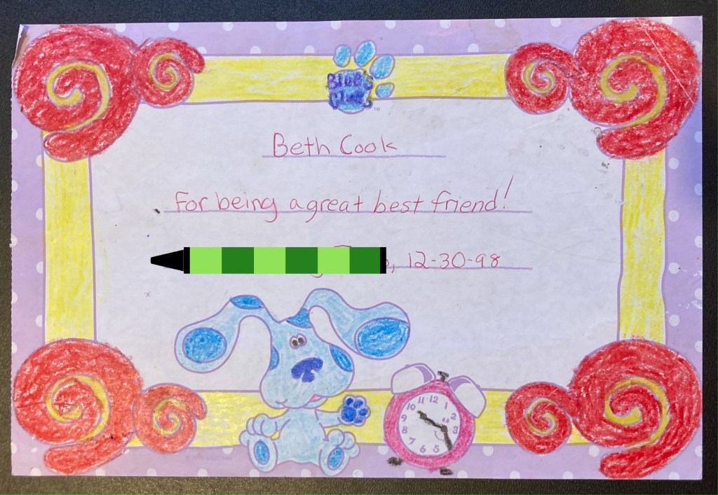 [Image description: Top line: “Beth Cook”; middle line: “For being a great best friend!”; bottom line: “{name redacted, covered the the green-striped Handy Dandy Crayon}, 12-30-98.” Yellow inside border, light purple outer border with white polka dots, red spirals in each corner, Blue’s Clues logo top center, Blue and Tickety Tock bottom center.]