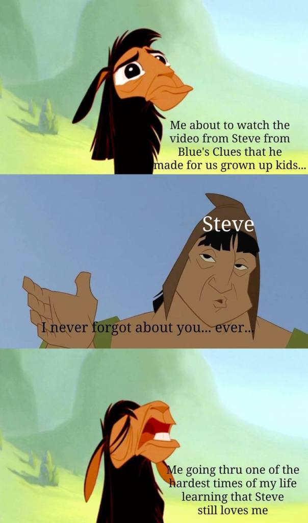 [Image description: 3-panel meme, base images from The Emperor’s New Groove. Top panel: Llama Kuzco with a sad expression and watering eyes, captioned “Me about to watch the video from Steve from Blue’s Clues that he made for us grown up kids…” Middle panel: Pacha labeled as Steve, gentle expression, one hand gesturing; captioned: “I never forgot about you… ever…” Bottom panel: Llama Kuzco sob-wailing, captioned: “Me going thru one of the hardest times of my life learning that Steve still loves me”]